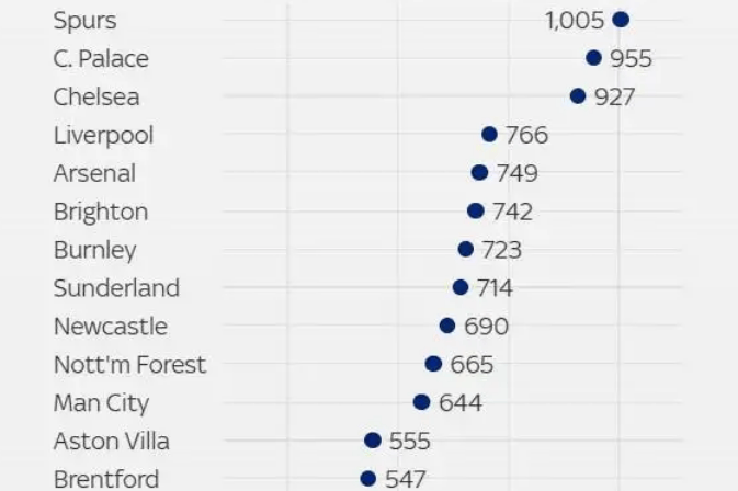 排名榜单第二的是水晶宫,955天,第三名切尔西也高达927天。利物浦与阿森纳分居四五,曼城仅第11,BIG6中健康情况最好的是曼联,他们只有432天,排名倒数第四,只有利兹联、西汉姆和富勒姆比他们情况更好。